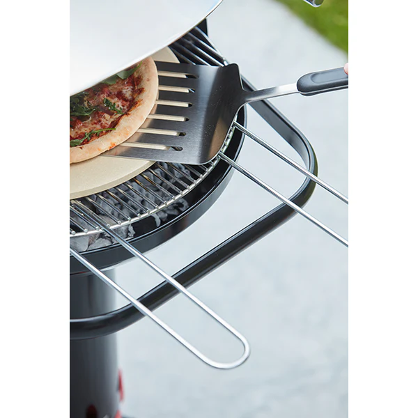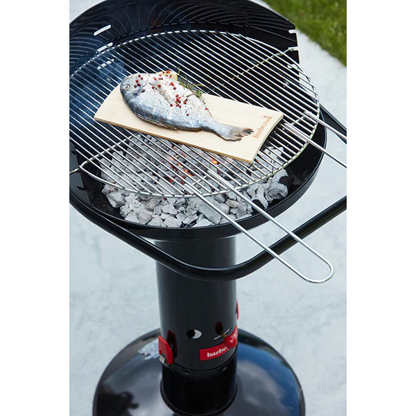 Grâce au système QuickStart de ce barbecue, l’allumage est simplifié. C’est très simple : il suffit de retirer la grille de fond et d’insérer du papier journal dans le tube d’allumage. Remettez ensuite la grille de fond en place. Ensuite, placez du charbon de bois ou des briquettes dans la cuve du barbecue. Après avoir allumé le journal à travers l’un des deux trous situés au bas de l’appareil, il convient de faire circuler l’air grâce à l’alimentation réglable au pied. Ainsi, l’air va circuler de bas en haut au travers des trous de la grille du fond. Quinze minutes plus tard, le charbon devient incandescent et il suffit d’ajouter du charbon de bois ou des briquettes pour que la cuve soit à demi pleine. Lorsque tout s’est transformé en braises, le barbecue est prêt à recevoir la grille de cuisson et les aliments. Le système QuickStop est infiniment pratique : avant de préparer le barbecue, remplissez la base d’eau. Lorsque le fond de la cuve a refroidi, retirez la grille du fond de la cuve avec une pince et faites tomber le charbon consumé dans le tube d’allumage : celui-ci va tomber dans l’eau, il ne restera plus qu’à vider le bas de collecte des cendres situé dans le pied.