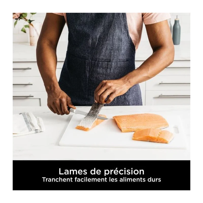 Vivez une performance incroyable et un aiguisage professionnel a domicile, encore et encore. Maintenez le tranchant avec un affûteur de couteau intégré dans le bloc de couteaux. Comprend un couteau de chef de 20 cm, un couteau a pain de 20 cm, un couteau a trancher de 20 cm, un couteau utilitaire de 13 cm, un couteau d’office de 9 cm et des ciseaux.