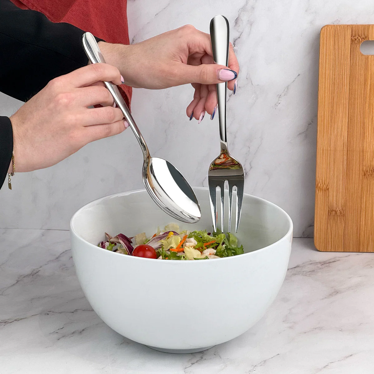 12 fourchettes de table, 12 cuillères de table, 12 cuillères à café, 12 couteaux de table, 12 fourchettes dessert, 12 couteaux dessert, 12 fourchettes à gateau, 1 cuillère de service, 1 fourchette de service, 1 louche et 1 pelle à tarte