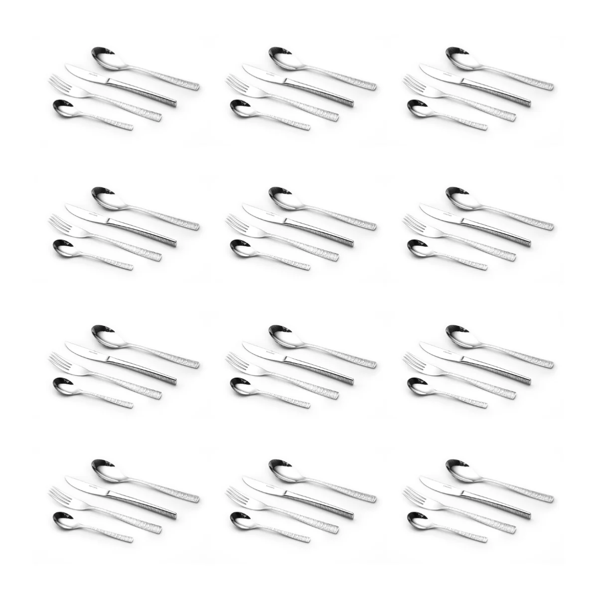 · 12 couteaux de table 8,0mm, 23cm dont lame 10cm· 12 fourchettes de table 3,5mm, 21,5cm· 12 cuillères de table 3,5mm, 21,2cm· 12 cuillères à dessert 3,0mm, 14,6cm