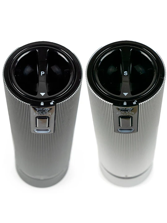 Ce duo de Moulin à poivre et à sel à tout pour plaire aux amateurs de design et de technologie : Un look contemporain irrésistible, un réglage de mouture ultra précis et breveté, une batterie rechargeable Lithium-ion. Ces moulins très compacts, sont équipés de mécanismes garantis sans limitation de duré, et s’utilisent d’une seule main, tout en cuisinant… avec style !