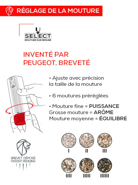 De plus, pour le moulin à sel son mécanisme en Zircone, innovation de la Recherche et Développement Peugeot permet de délivrer du Sel Glace, d’une finesse extrême, offrant ainsi le plaisir gustatif du sel en limitant la quantité utilisée. Son système de réglage de mouture u’select, également exclusif à Peugeot, offre 6 positions de réglage pour ajuster au mieux la finesse de la mouture de votre sel sec, du sel glace au sel croquant. Mécanisme ZIRLION, garanti sans limitation de durée.