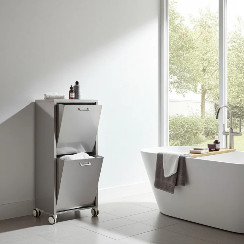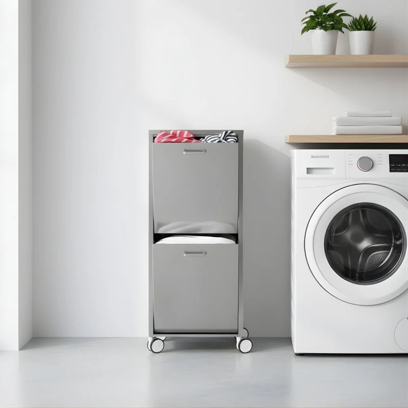 Il se présente sous la forme d’un meuble auxiliaire entièrement en Acier Inoxydable qui se compose de deux compartiments. Les deux compartiments de 35 litres permettront, par exemple, de séparer le linge blanc de la couleur.