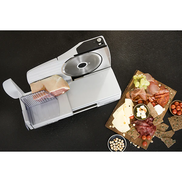 Très simple à utiliser, la trancheuse se met en route avec un bouton marche/arrêt. Le plateau est amovible pour apporter directement les tranches à table. Le chariot, le poussoir et la lame sont amovibles pour un nettoyage optimal.